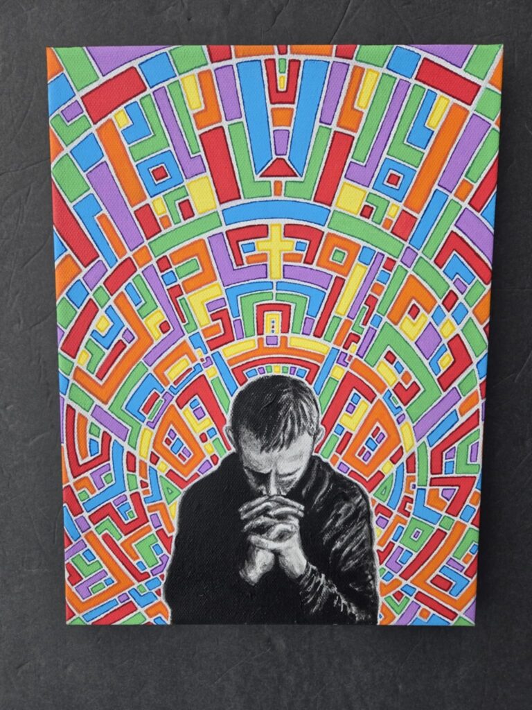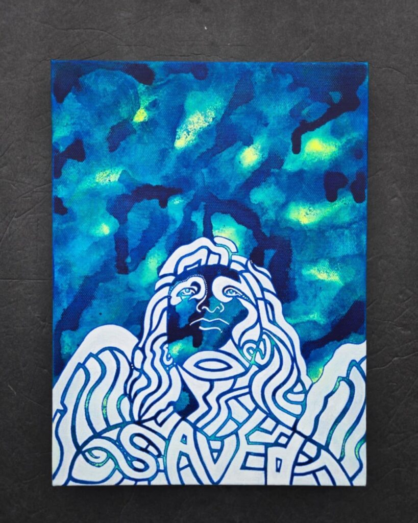 “I do traditional portraits, but with a twist,” he explains. “I usually hide words or phrases in the background—people’s names, quotes, symbols that connect to the piece. I want my art to be interactive. I want people to look again and again and find something new.”